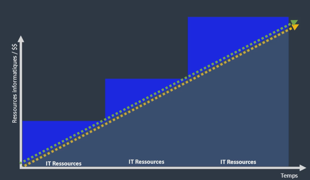 Ce graphique représente le résultat entre les ressources informatiques par rapport à leurs coûts, du moins une estimation sur le long terme. On met cette estimation sur une durée, qui en fonction de sa croissance a des budgets qui augmentent. On estime alors le coût, et si nos estimations sont bonnes, on aura une infrastructure qui conviendra totalement à la demande client.